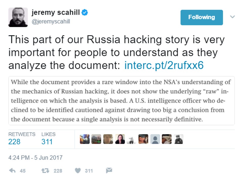 On the other hand, maybe this is not a big deal at all! Glenn Greenwald and Jeremy Scahill, co-editors of The Intercept, do not have bylines on this piece. We imagine, considering their history on All Things Russia, that the Intercept journalists who got this leak required their bosses to recuse themselves from the story like a common Jeff Sessions and Devin Nunes.