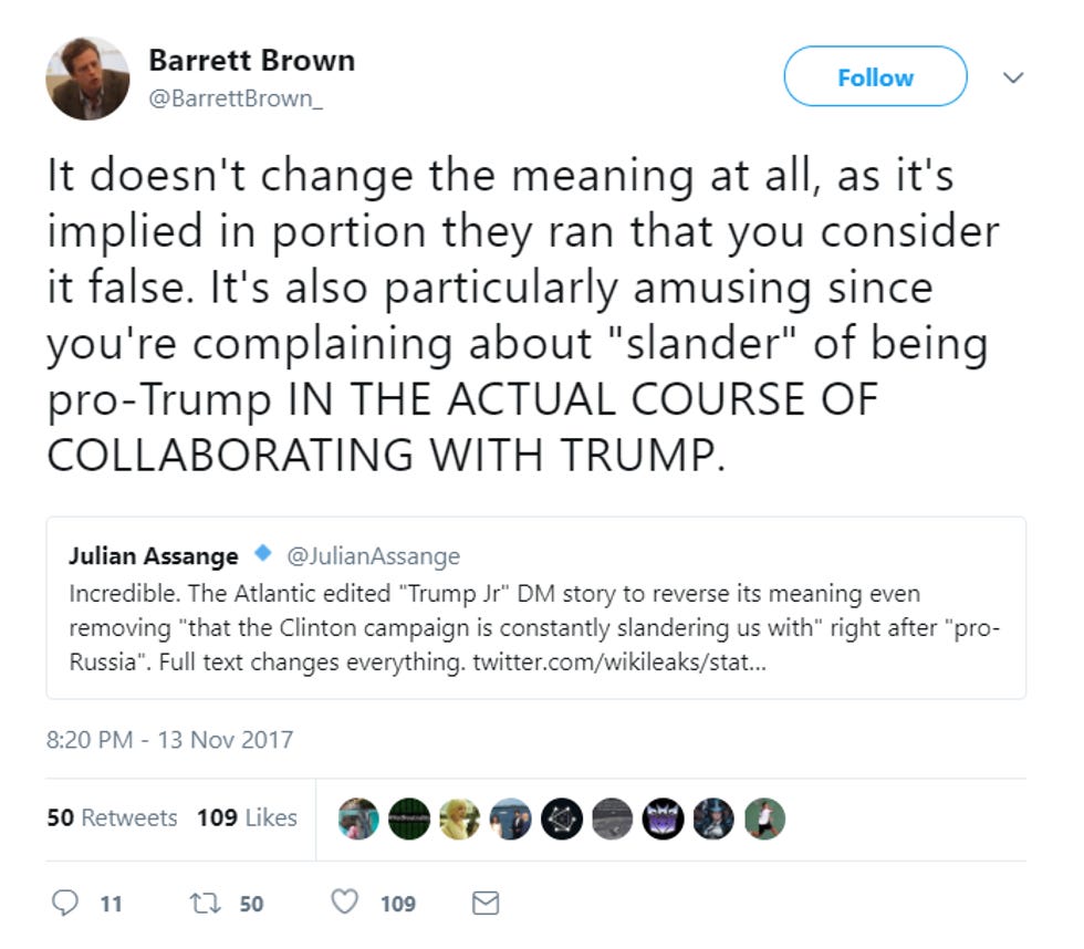 Brown explained that he had defended WikiLeaks for releasing emails hacked from the Democratic National Committee, “because it was an appropriate thing for a transparency org to do.” But, he added, “working with an authoritarian would-be leader to deceive the public is indefensible and disgusting.”