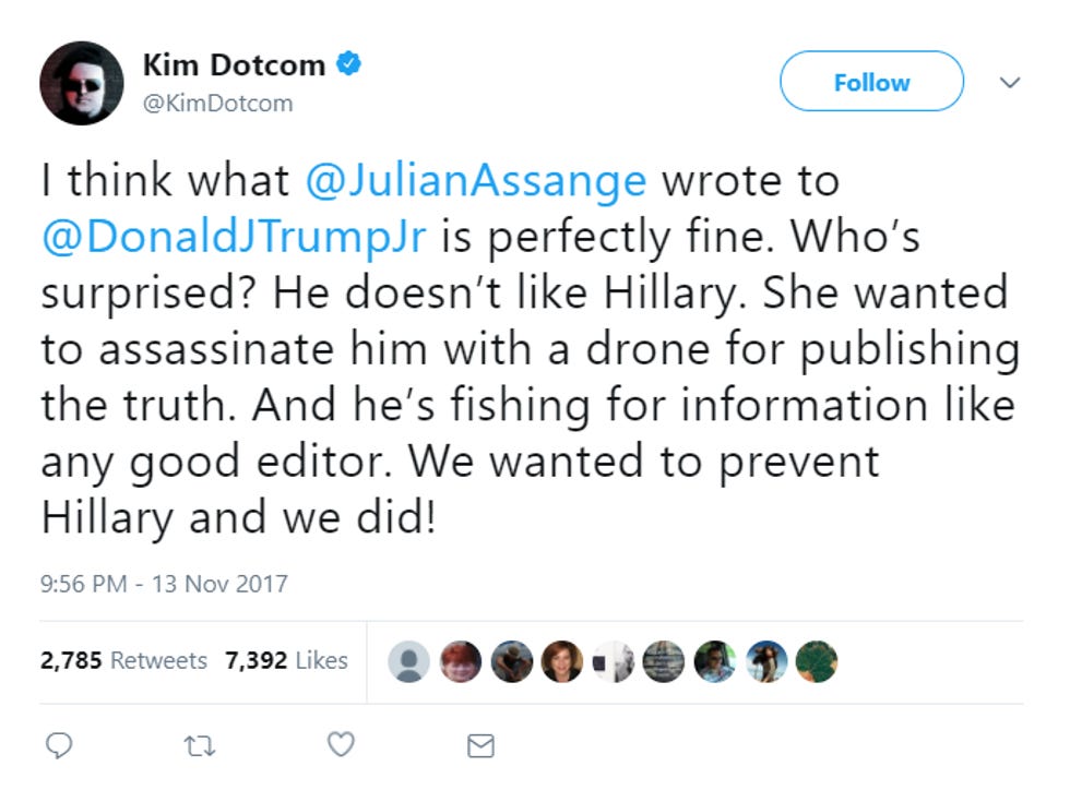 Now, don't fret and think everybody is dumping WikiLeaks. The bizarre basement hacker KimDotcom, who helped write the fantastical conspiracy theory that DNC staffer Seth Rich was murdered for giving WikiLeaks the Democratic emails the Deep State says were supposedly hacked by Russia, and who has palled around with Sean Hannity and Glenn Greenwald in furtherance of that cause, thinks Assange advising Trump's ill-shaped firstborn son is hunky dory: