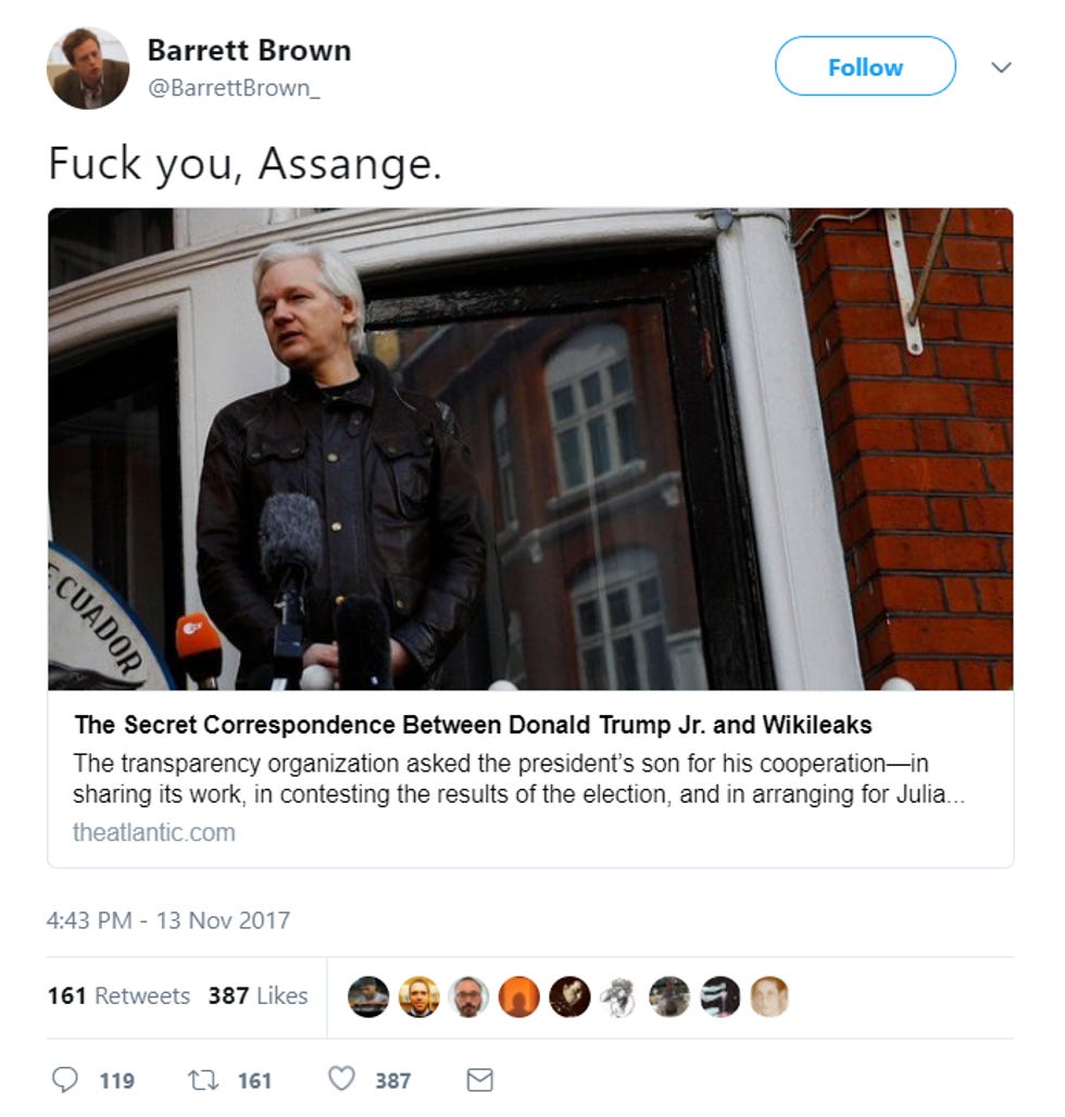 Brown had a visceral reaction to the news, first reported by The Atlantic, that WikiLeaks had been advising the Trump campaign. In a series of tweets and Facebook videos, Brown accused Assange of having compromised “the movement” to expose corporate and government wrongdoing by acting as a covert political operative.