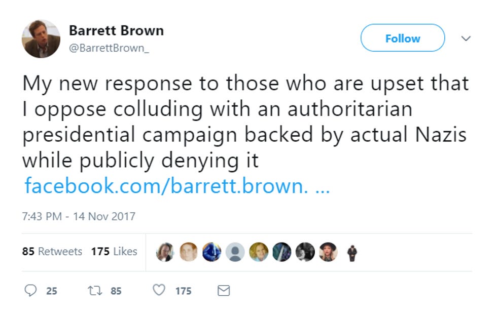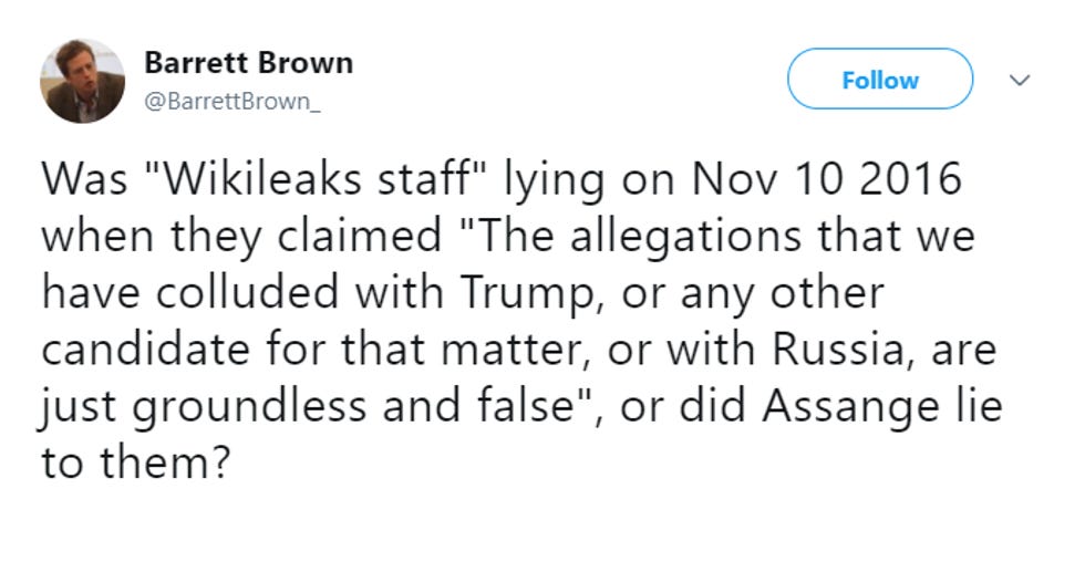 The Intercept's "Dear John" letter to WikiLeaks is actually fairly decent, because it wasn't written by Glenn Greenwald, who is as always cordially invited to go fuck himself. It starts with the story of journalist Barrett Brown, who believed the "transparency organization" was actually a "transparency organization," and not a Kremlin front working to elect Trump president. Brown actually went to jail for his work on behalf of WikiLeaks, and he is pissed: