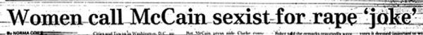 John McCain's always had a hearty arsenal of "cocktail party jokes," including several about killing Iranian civilians with either bombs or exported American cancer, and another about Chelsea Clinton being ugly because her father is Janet Reno's penis. These jokes, however, can't shake a stick at the latest gem someone has unearthed from a 1986 copy of the Tucson Citizen , one that got him in a tit-bit of trouble at the time. After the jump: McCain's crack about the gorilla who rapes and murders some gal in the street .