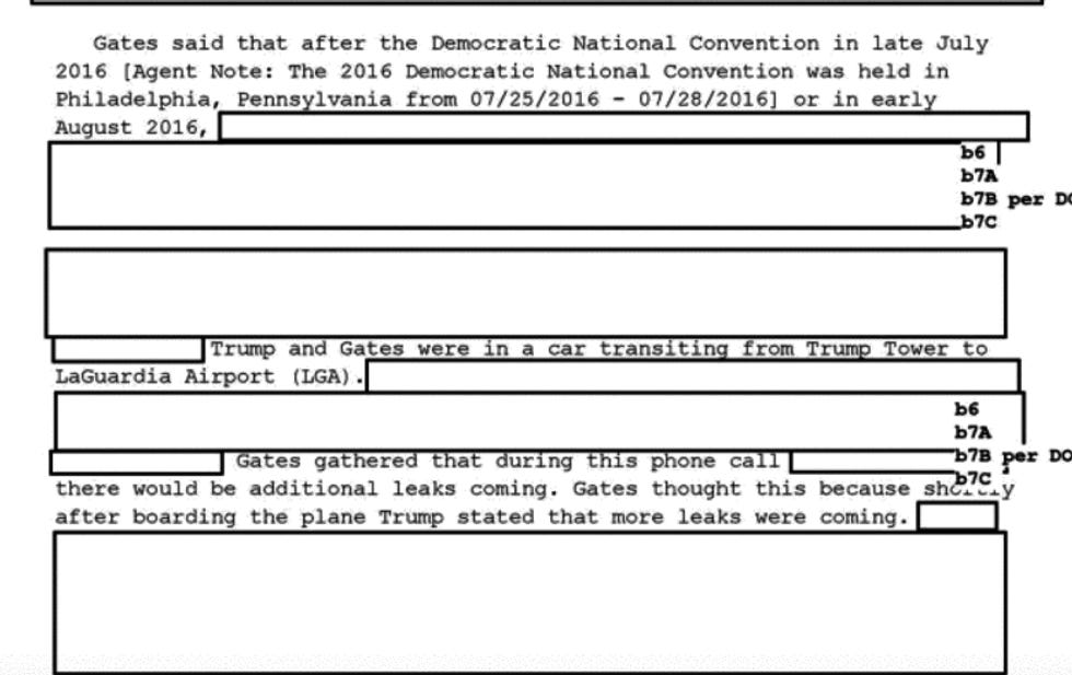Oh yes, and who can forget that time Donald Trump and Rick Gates were riding in the Camry together (it was not a Camry) on the way to the airport, and Trump talked to [REDACTED BUT DEFINITELY ALMOST CERTAINLY ROGER STONE ], after which Trump very confidently reported that more WikiLeaks were on their way. (p. 42)