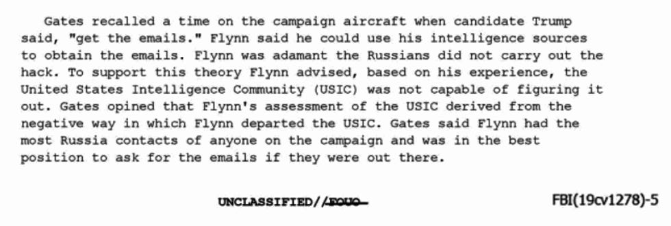 Gates recalled a time on the campaign aircraft when candidate Trump said, "get the emails." [Michael] Flynn said he could use his intelligence sources to obtain the emails.Flynn was adamant the Russians did not carry out the hack.To support this theory Flynn advised, based on his experience, the United States Intelligence Community (USIC) was not capable of figuring it out.