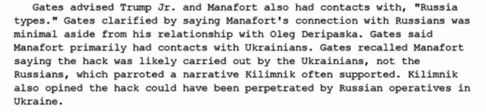 Gates advised Trump Jr. and Manafort also had contacts with, "Russia types." Gates clarified by saying Manafort's connection with Russians was minimal aside from his relationship with Oleg Deripaska. Gates said Manafort primarily had contacts with Ukrainians.Gates recalled Manafort saying the hack was likely carried out by the Ukrainians, not the Russians, which parroted a narrative [Manafort's Russian spy buddy partner Konstantin] Kilimnik often supported.Kilimnik also opined the hack could have been perpetrated by Russian operatives in Ukraine.