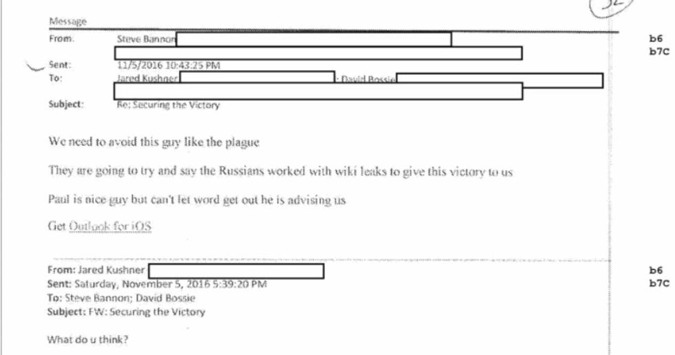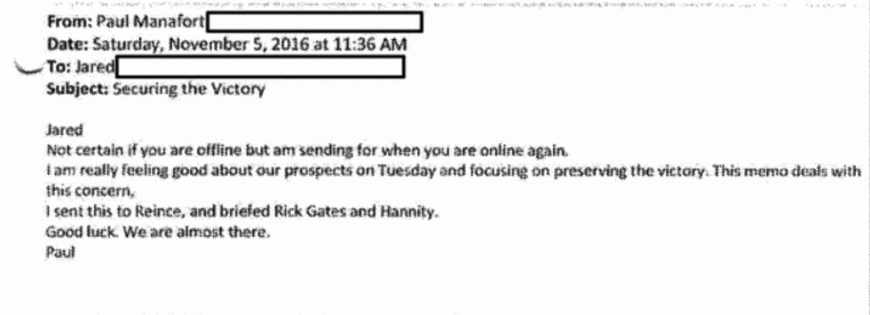 As a postscript to this post, we feel we should note that we have been vindicated in our predictions yet again SEVERAL TIMES in these documents, and one example is that our speculation was correct about how long Paul Manafort was really advising the Trump campaign, even though he had been "fired" in August. Here's an email Manafort sent Jared Kushner three days before the election on "securing the victory" and how good he felt about their chances. (p. 238)