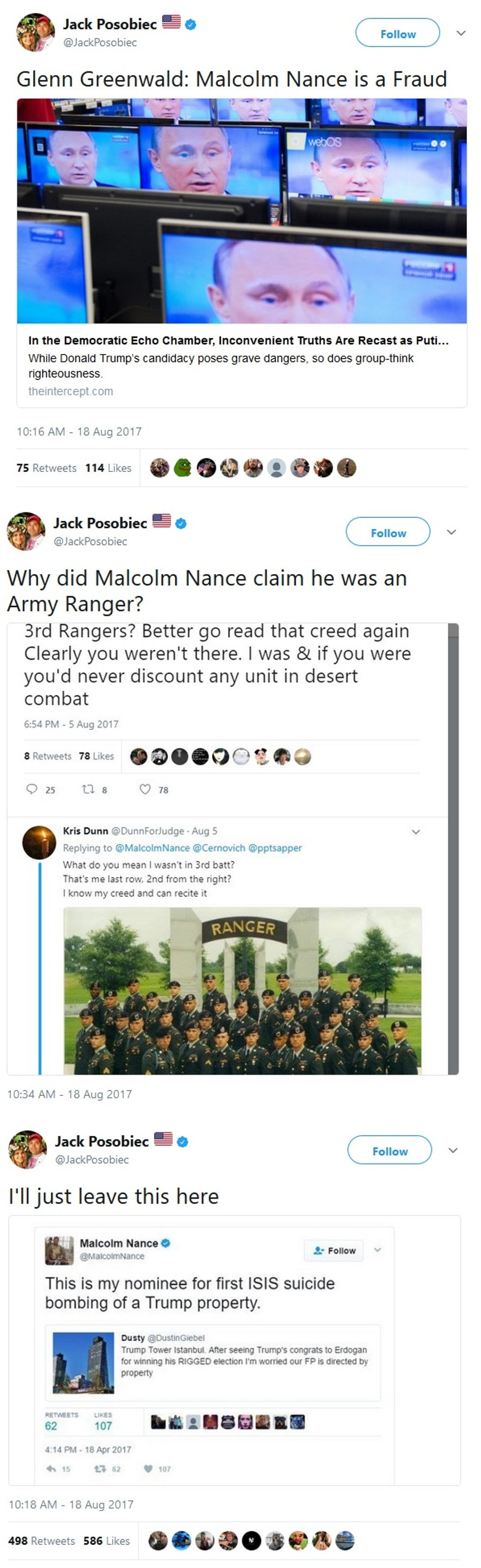 Nance didn't claim to have been a Ranger; he said "I was there" in reference to Iraq, not in the Rangers, and he said it in a (dumb) thread started by Posobiec's wingnut buddy Mike Cernovich claiming H.R. McMaster "fears" Cernovich. And the tweet about Trump Tower in Istanbul is a prediction (however inartfully phrased, as they say), not advocacy.
