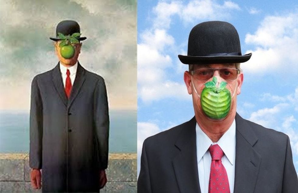 It's Sunday, and you know what that means: Time to turn off the news for a little while and recharge your batteries, but if you need to run to the store and buy batteries, remember your face mask. If you're an especially lucky human with an artsy person in your life, maybe your face mask will look like this brilliant homageto René Magritte's "The Son of Man," by Twitter person "LONye" :