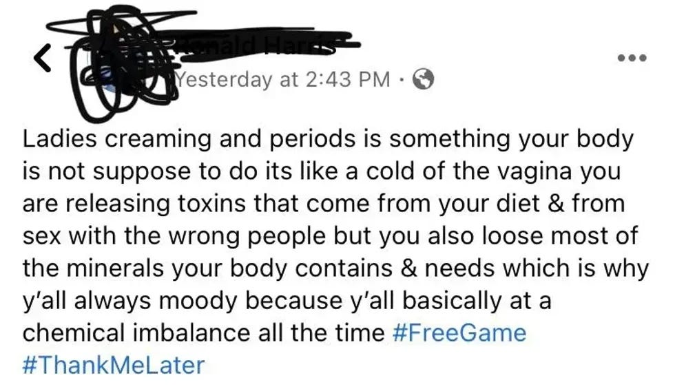 Or "Ladies creaming and periods is something your body is not suppose to do it's like a cold of the vagina you are releasing toxins that come from your diet & from sex with the wrong people but you also loose most of the minerals your body contains & needs which is why y'all always moody because y'all basically at a chemical imbalance all the time #FreeGame #ThankMeLater"