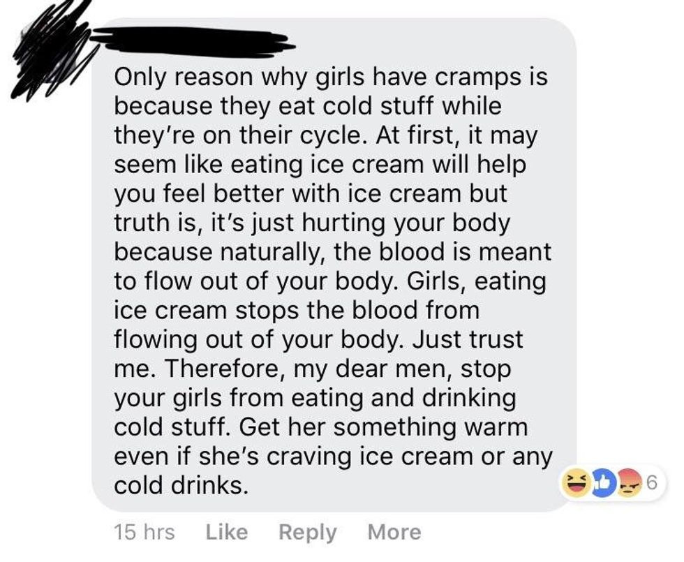 Or "Only reason why girls have cramps is because they eat cold stuff while they're on their cycle. At first, it may seem like eating ice cream will help you feel better with ice cream but truth is, it's just hurting your body because naturally, the blood is meant to flow out of your body. Girls, eating ice cream stops the blood from flowing out of your body. Just trust me. Therefore, my dear men, stop your girls from eating and drinking cold stuff. Get her something warm even if she's craving ice cream or any cold drinks."