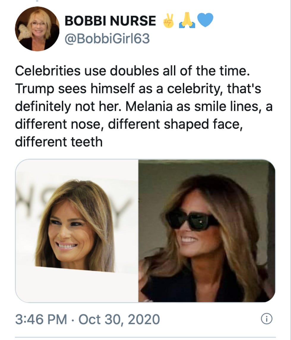 Wonkette doesn't officially agree with USA Today' sconclusion . Rebecca strongly believes that this “woman isn't Melania." Fake Melania's teeth are round, and Real Melania's teeth are flat, like her entire disposition. Twitter users have also suggested that the Fake Melania is Trump aide Hope Hicks, but that would make this flattering photo of Fake Melania a bad photo of Hicks. COVID-19 is brutal, but I don't think it aged Hicks 15 years.