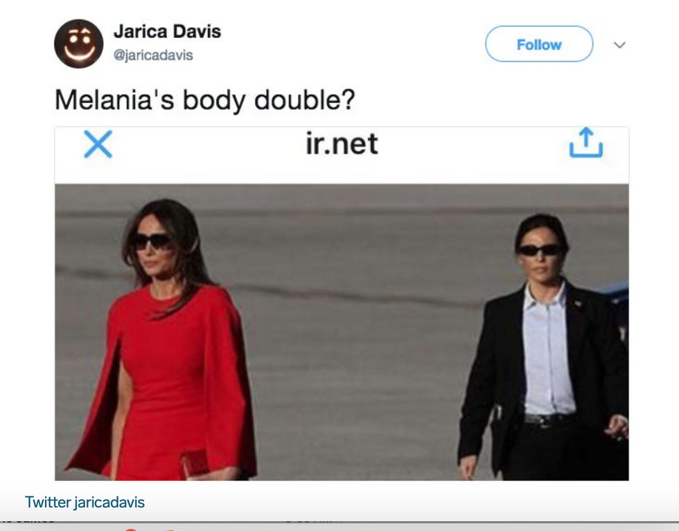 Others have speculated that Fake Melania is a secret service agent who also doubles as Melania Trump. Let's hope she has a SAG card or the unions will go crazy. This was also the plot of one of my favorite “Xena: Warrior Princess" episodes.