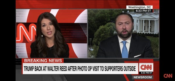It took until Miller was confronted by CNN's Ana Cabrera to finally have him called out. Of course, Miller also had the misfortune of appearing just after Donald Trump decided to get in a hermetically sealed vehicle with Secret Service agents while having a highly contagious virus so he could wave at a crowd of sycophants like an anti-Pope.