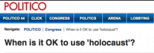 Oh my god, truly terrible publication The POLITICO has created a H/holocaust style guide. Like an actual collection of words published on politico.com that serve to outline when it is okay to invoke lower case-h holocaust and when it is okay to go all WWII insidery and just GO FOR IT and use the capital H. "When is a holocaust not the Holocaust?" is the actual lede of this non-specific genocide of an article.