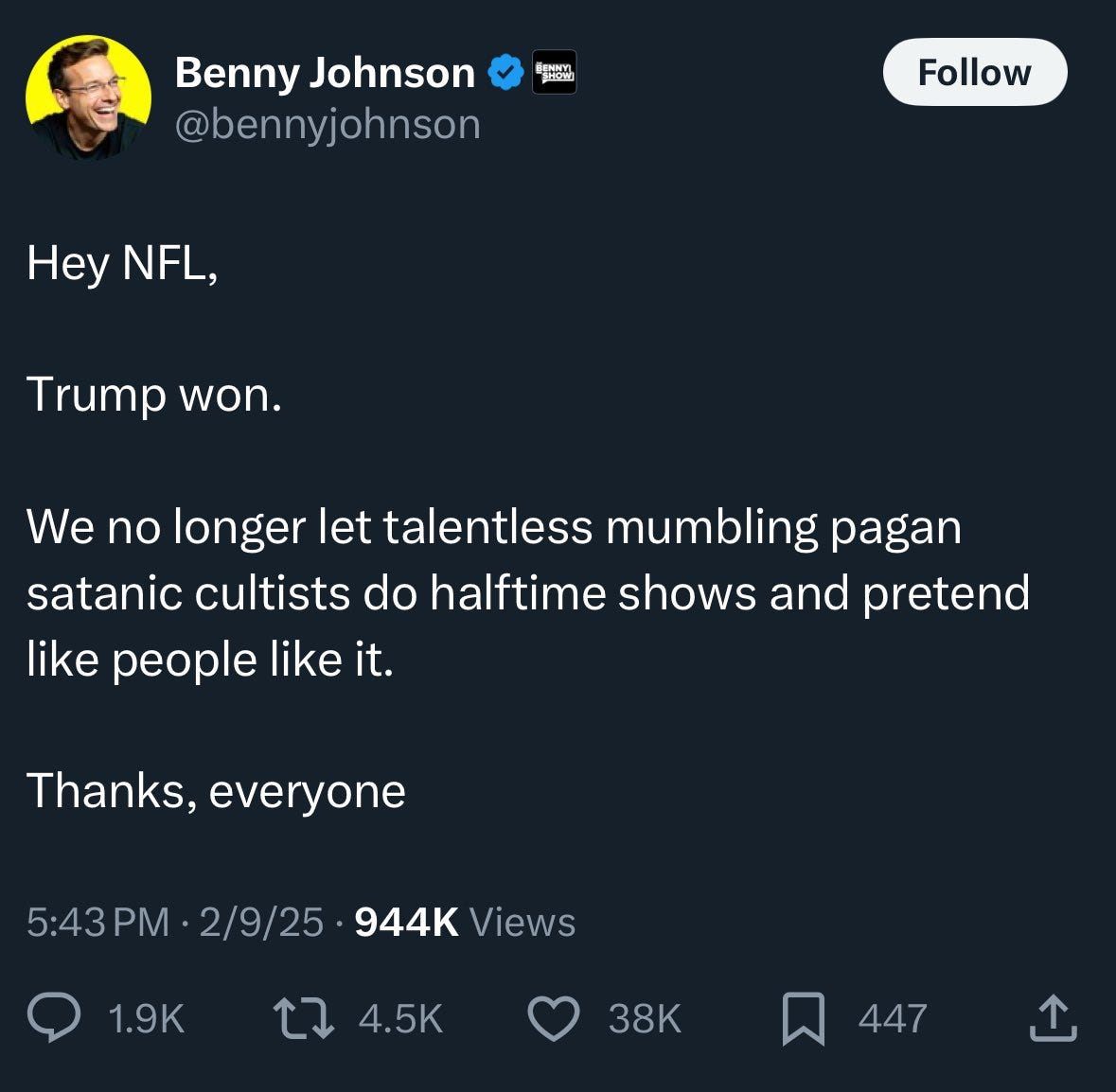 As if they wouldn’t have complained about it while Joe Biden was president. Please. They call the Super Bowl halftime show Satanic literally every year.