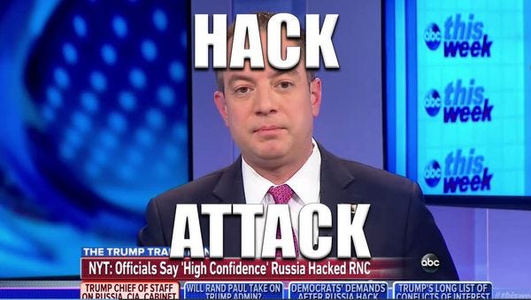 Meanwhile, Trumpkins have gone out of their gourd upon being accused of what could potentially amount to treason with Reince Preibus saying that the RNC wasn't hacked because you never saw hacked RNC documents, while Kellyanne Conway blathers about how the FBI and the CIA don't have a "consensus view," so it's clearly false information and the politicization of our intelligence agencies.