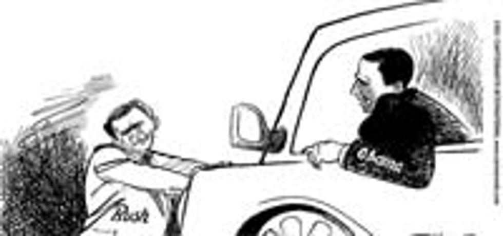 And that's one bit of continuity that will persist into the new Obama Administration, because the president-elect is a jokester as well! For instance, when Obama came to visit Bush for their first post-election meeting, he arrived a little bit early, then tried to run Bush over with his car. Fun! Bush had a god laugh about it, too, six to eight weeks later, when his shattered legs had healed.