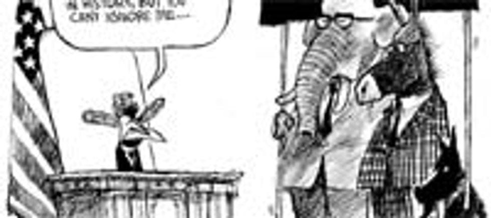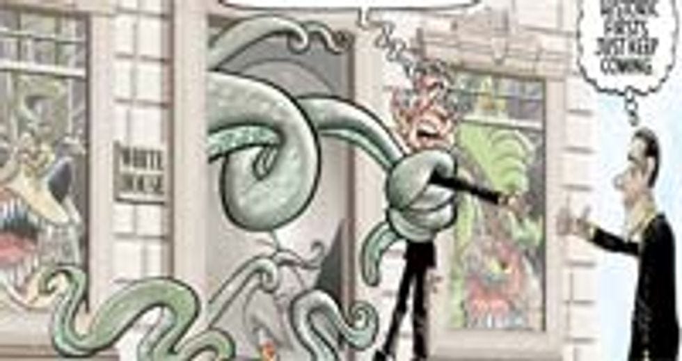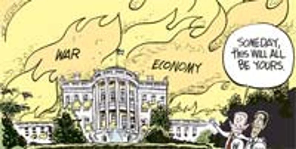 Unfortunately, the historical presidential meet-and-greet didn't go exactly as planned. Obama wasn't able to actually go inside the executive mansion, because the whole building was still lousy with terrifying demon-beasts with clammy tentacles and razor-sharp teeth, ready to feast on first the flesh and then the souls of whatever unwitting human victim makes the mistake of stumbling into their lair. We like to call these hell-demons "the Bush Cabinet!" Ha ha, get it? Because they're so awful! They stand in marked contrast to the future Obama cabinet, which will be composed entirely of Clinton retreads and best depicted as a nest of angry, mangy rats.