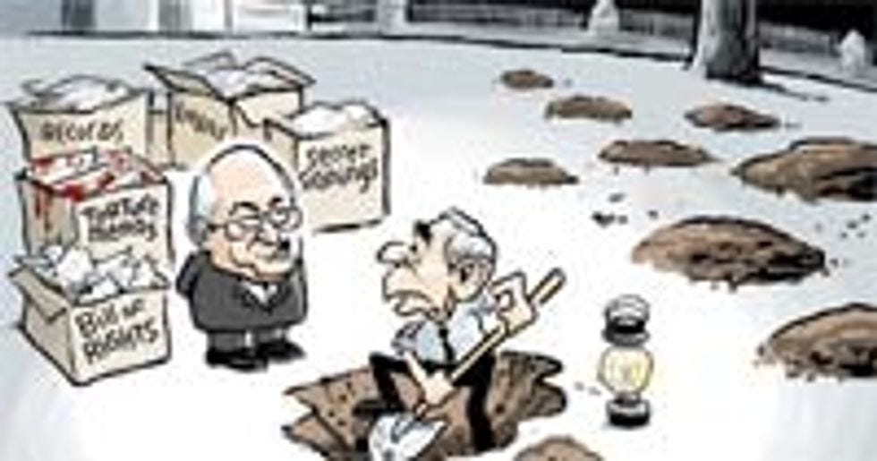 Still, this administration hasn't lost its sense of humor! Just last week, for instance, Dick Cheney played one of his hilarious practical jokes: he rousted Bush in the middle of the night, forced him out to the White House lawn at gunpoint, and then made him dig his own grave, while his Secret Service detail laughed and laughed. Eventually, they let the President in on the joke, after Cheney had shot him in the face once or twice, and he thought it was pretty funny too! Oh, the japes those fellows will get into.