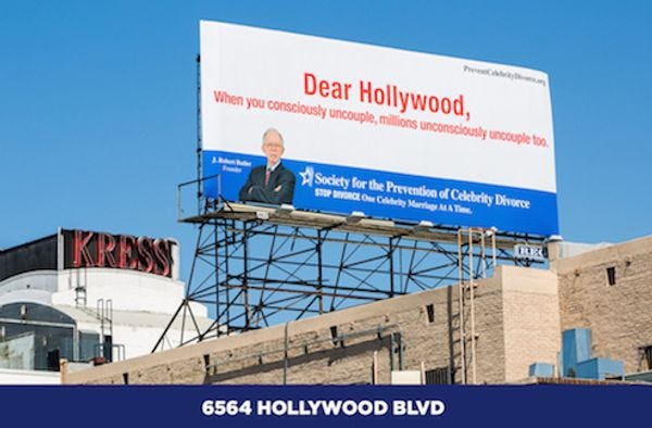 We will preface this by saying we have no idea if this is an elaborate joke or the quixotic crusade of one clearly fairly wealthy individual, because we do not care. We are in love with J. Robert Butler, founder of the Society for the Prevention of Celebrity Divorce, because there's something so charmingly retro and wrongheaded about his effort to ... stop celebrities from getting divorced.