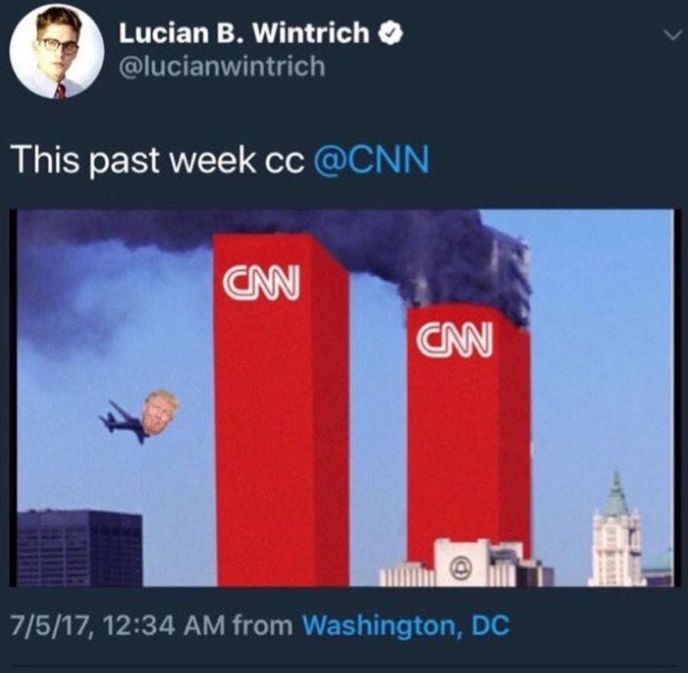 He soon deleted it, at "people's requests," because apparently the poor lad hadn't considered that in this particular analogy, CNN is America, and Donald Trump is Evil Al Qaeda Terrorism.