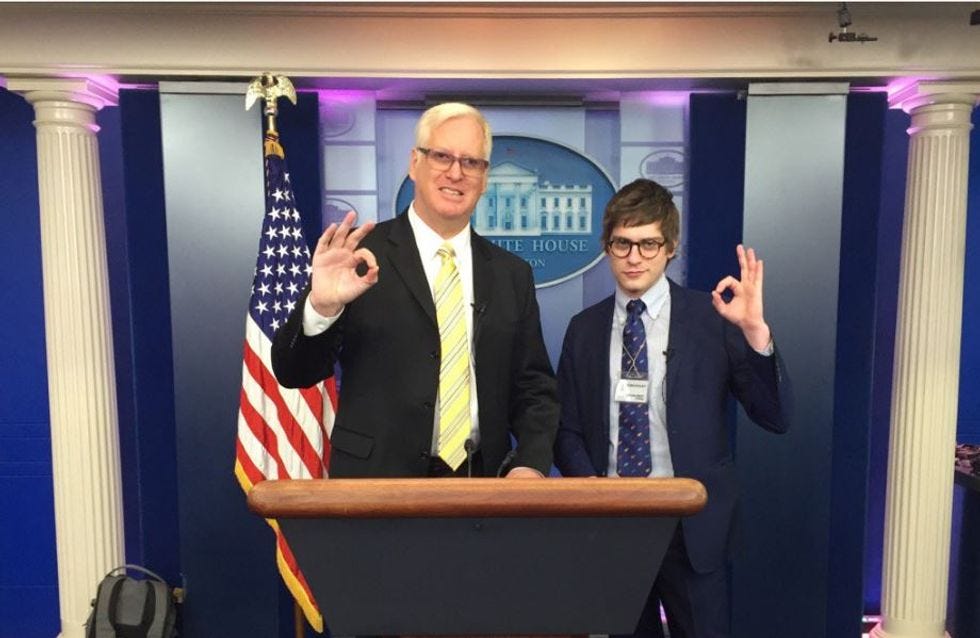 Wintrich, had of course already scaled the heights of American journalism by making "ironic" white power signs (it is of course a very tiresome thing, wherein the "alt right" make up their own fake news "gotchas," by pretending the "okay" sign is a white power sign, and if you say "hey that okay sign is a white power sign because they said so," they sue you ) at the White House press podium.