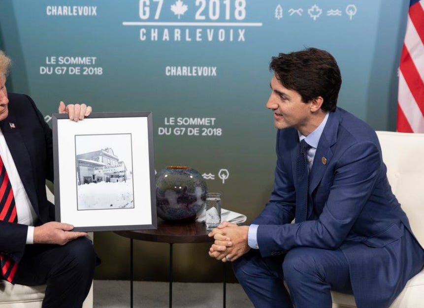 The Charlevoix summit was also the first indication of Trump’s personal dislike for Justin Trudeau, whom he called “very weak and dishonest” on Twitter from Air Force One shortly after the Irish goodbye. While the consensus is he got jealous after seeing photos of Melon and/or Ivanka looking at him all thirsty, there’s an argument to be made Trudeau might’ve made things worse by taunting him with an old photo reminding the world the dumb motherfucker only owes his wealth to his grandfather’s days of running a whorehouse in the lower Arctic.