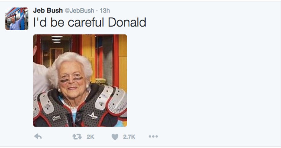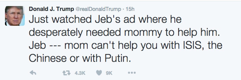 Surprising no sentient being in the universe (Jeb Bush's campaign staff is not in fact sentient), Donald J. Trump takes exception to Jeb Bush pulling on his mama's apron strings.