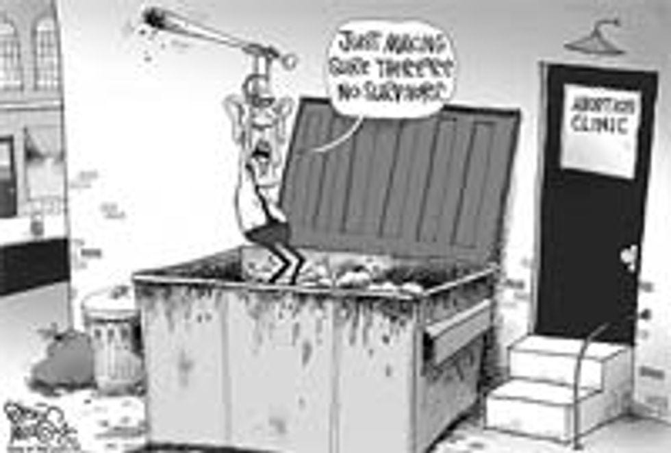 Now, we're not saying that Obama feelsgoodabout this or anything. He's actually rather tortured by it, so he deals with his forbidden lust the only way he can: by actively trying to prevent the birth of new children. That's why he's here in a dumpster behind an abortion clinic, beating fetuses to death with a bat. They'll just grow up to be little temptations!