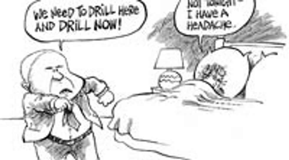 McCain, by contrast, has had a pretty good couple of weeks. He's really showing the American people that he's someone they can relate to, not a weirdo like his dorkwad opponent! Here you can see him taking part in the sort of pastime ordinary patriotic men do every night across this great land of ours: coming back to one of his eleventy jillion houses and angrily demanding sex from his unwilling wife. That's leadership we can believe in, my friends!