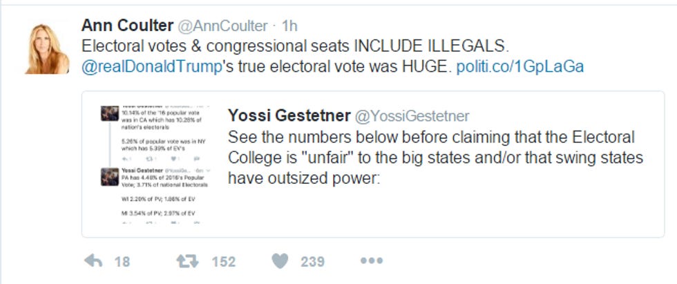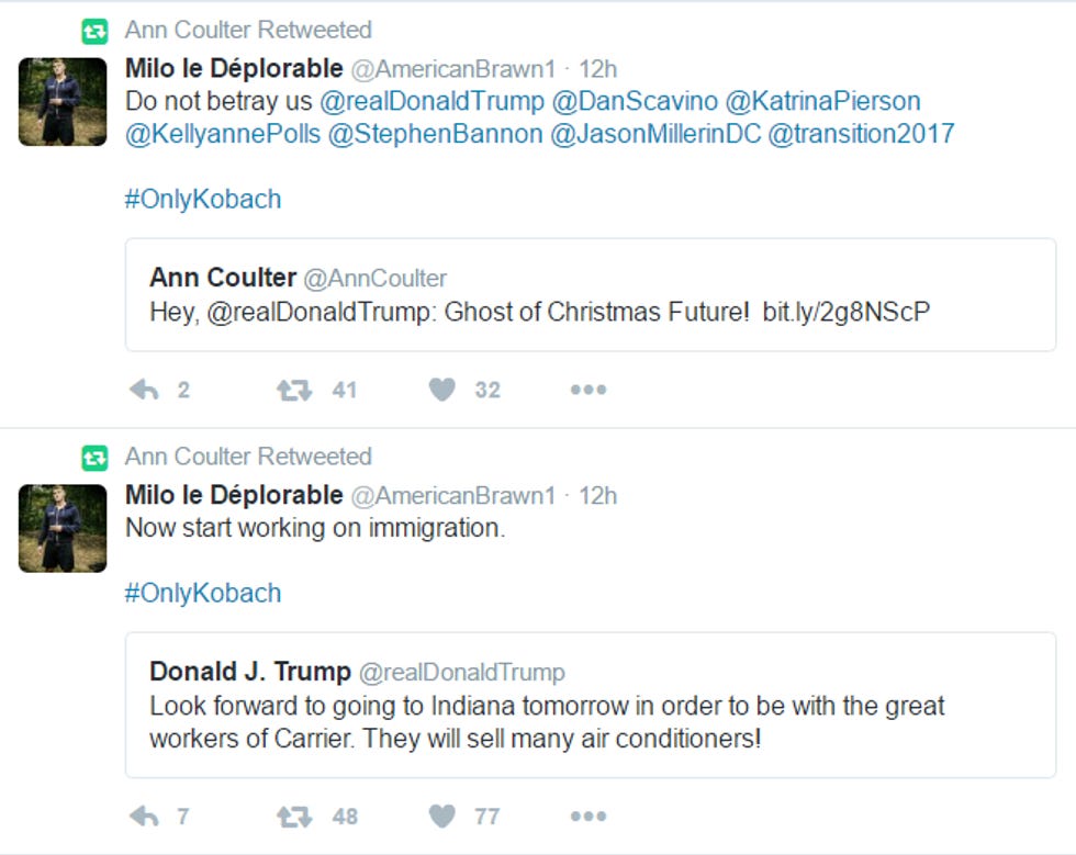And how would Trump know what sort of presidenting he's supposed to do that day, if Coulter didn't retweet deplorables happy to provide him instructions?