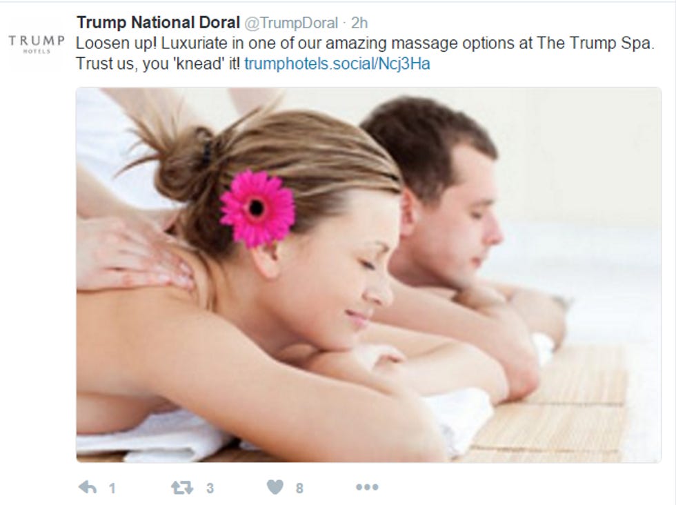 As we all know, Donald J. Trump loves him some Twitter. And when he signs on to see what is happening on the Twitter machine, he is able to tap in to all the most interesting news that's happening out there in the world, as filtered through the lens of whatever Ann Coulter and Greta Van Susteren are wee-weed up about at the moment. Oh, and he sees ads for his own hotels, in case he forgot he owns those hotels and might like to get a massage at one of them.