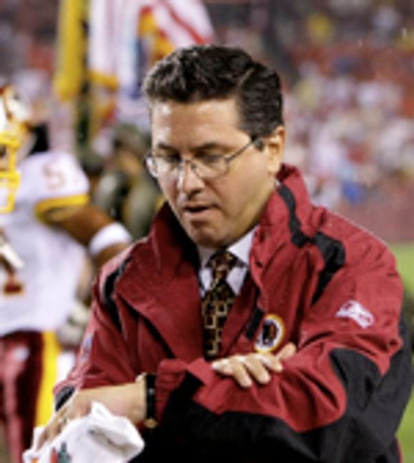 TheWashington Posthas an excellent (but long!) feature today about how, when season ticket holders with multi-year contracts default on their payments -- which happens quite often now due to the recent evaporation of all global wealth -- the Redskins lawyers immediately SUE THEIR KNICKERS OFF and always win and demand full repayment of the total cost of the contract (+ interest!) which forces all of these people into deep bankruptcies that fucking fuck them for the rest of their lives. And then they resell the season tickets, and the cycle starts anew! The point is: fuck this stupid team and their farty owner Dan Snyder, who is mean.