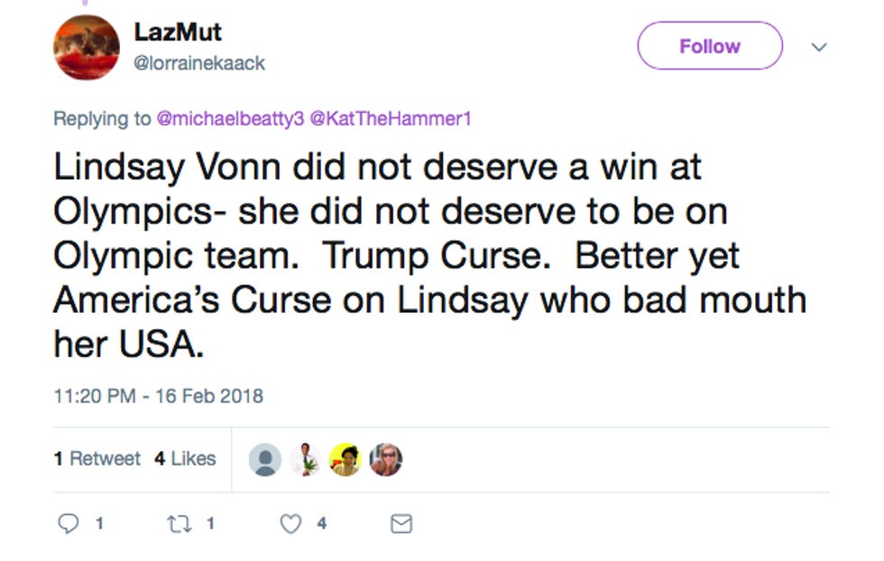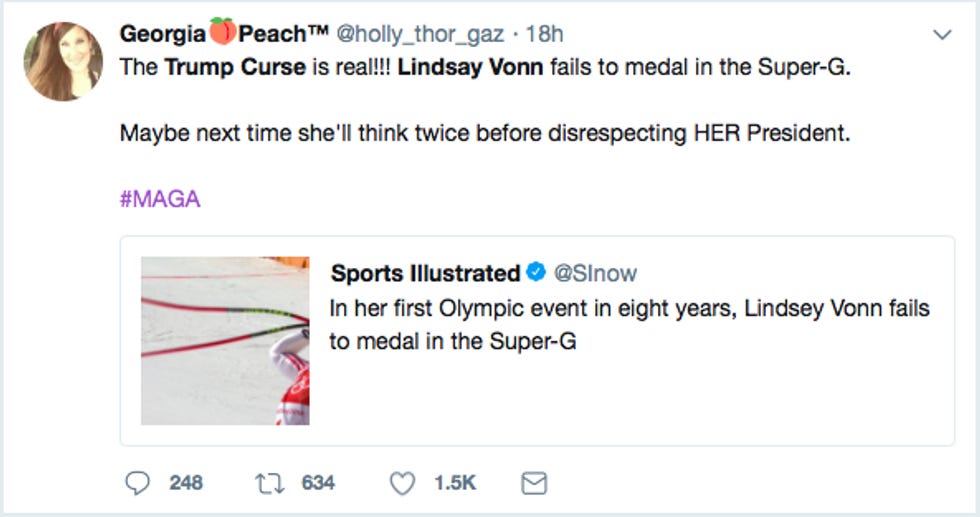 The latest victim of this supposed curse, they claim, is Olympic skier Lindsey Vonn. According to the Trumpists, the reason she did not get a medal this year was because back in January, she told CNN's Alpine edge that she was not representing Trump in the Olympics.