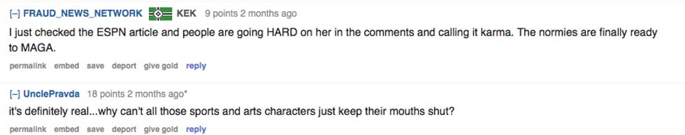 There were at least three threads on the subject, though most of the comments were variations on the same theme -- that this should be a lesson to sports stars and celebs to NEVER say anything bad about their precious Trump. Or else they will get KARMA'D!
