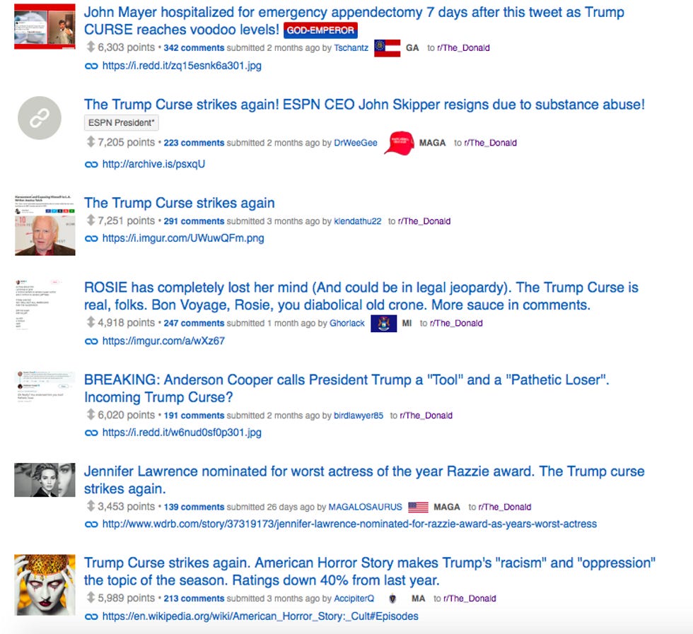 As you may know, some of the frothier Trump supporters are quite esoteric, believing that the Pepe the Frog is an avatar of the Egyptian god Kek, come to make Donald Trump GOD EMPEROR OF THE UNITED STATES OF AMERICA. Or as they call him "GEOTUS." They hold many superstitions, one of which is the supposed "Trump curse," in which bad things happen to people who publicly disparage Donald Trump.