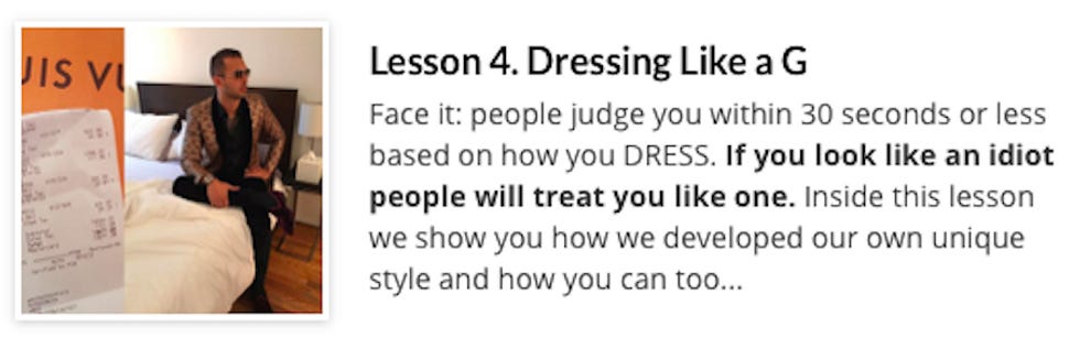 The course includes important lessons like "The Voice That Makes The Pussy Wet" and "How To Get Rich (For Real)" and "How To Get HOT Girls." There is of course a lesson on "How To Dress Like A G," which apparently means wearing the same smoking jacket all of the time.