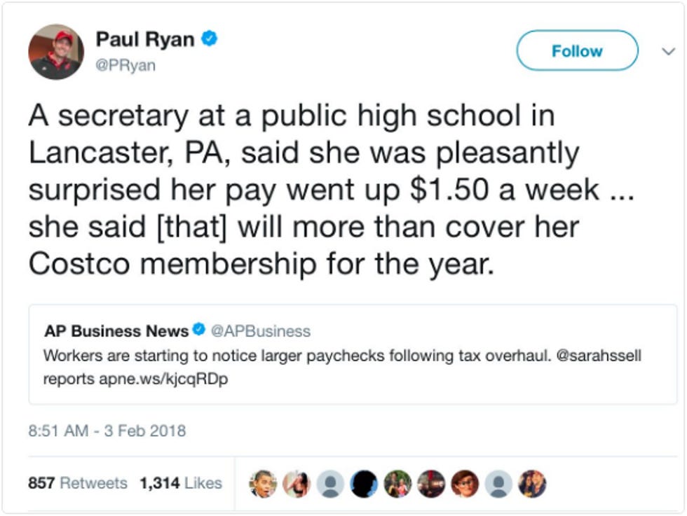 On the bright side, given that the couple only collectively earned $550 a year prior to losing their jobs, had they received the kind of benefits working people now are getting from the tax cut, they would have been rightfully thrilled. A dollar fifty a week would have seemed like a lot in those days! Paul Ryan would have been a Depression-era HERO!