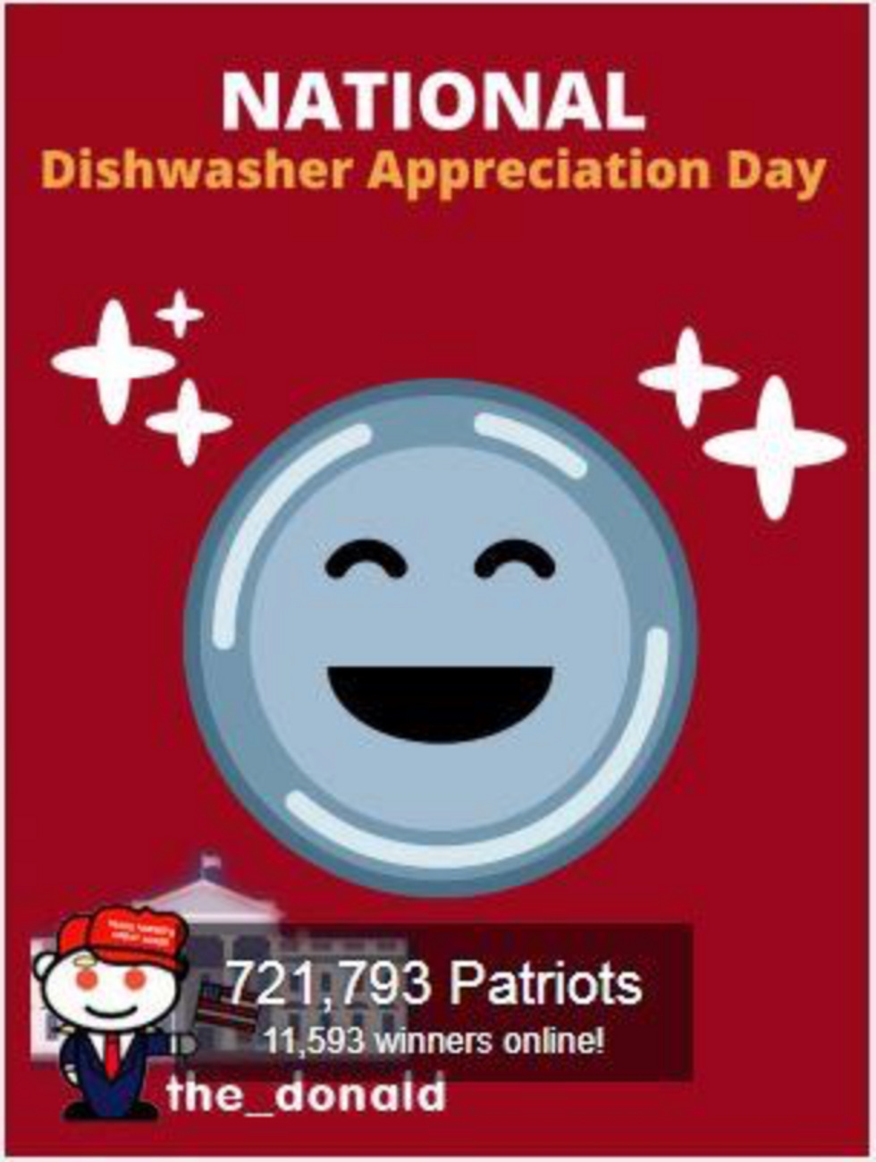 Our first stop this Saturday is to the pro-Trump message board r/The_Donald, which briefly changed its sidebar image yesterday -- which was International Women's Day -- to celebrate "National Dishwasher Appreciation Day." Get it, because ladies are supposed to do your dishes?