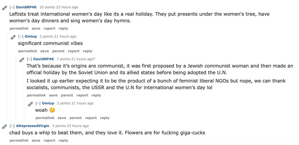 The incels over on the braincels subreddit mostly chose to celebrate International Women's Day with their regular dumb memes and stewing about seeing "normies" buying their girlfriends and wives flowers at the grocery store, even though (the incels imagine) said girlfriends and wives are probably cheating on them WITH CHAD.