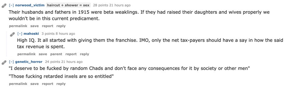 Alas, the incels actually all agreed that it was very bad for women to vote in the first place. Because if women couldn't vote, they'd all have girlfriends. Obviously.