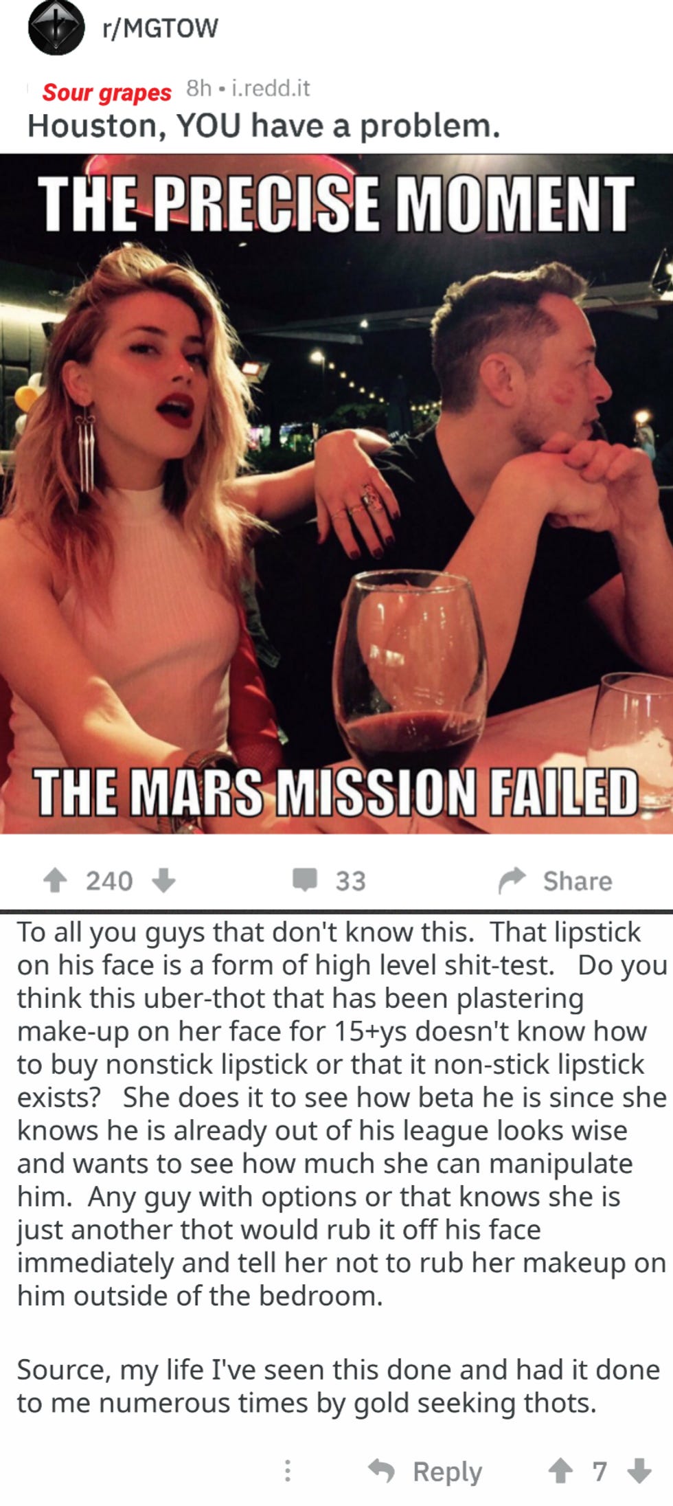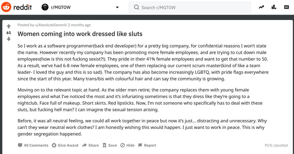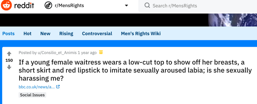And then there's this one , in which a Man Going His Own Way listed all of the things "females" do to attract men — so that we can seduce them and then divorce them and then collect all of those sweet sweet alimony checks.