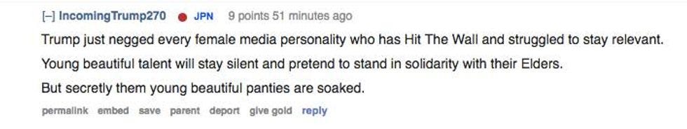 Ugh, you know he wants this to be true so badly. Like, more for himself than anything else. It's actually really amazing how desperately committed male Trump supporters are to wanting to believe that women secretly find Donald Trump sexually appealing. It's a whole thing for them and it is very sad. Like they just really need to believe that 70-year-old men who smell like fake tanner and expired ketchup mixed with cheap cologne (probably) and who behave like eight-year-old school yard bullies are what does it for all of us.