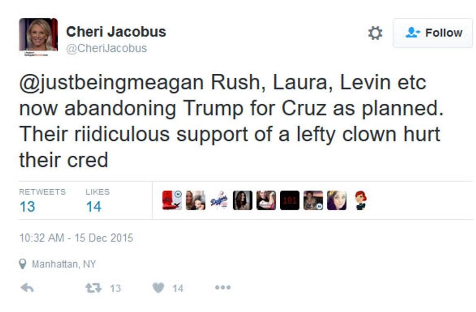 Commonly known as "catfishing," Wessel posed as a number of phony people and then engaged them on the Interwebs like a Nigerian prince who's just discovered a long lost relative. For several months Wessel went under the now-deleted Twitter alias @JustBeingMeagan, and claimed to be Meagan Lancaster, an American ex-pat lawyer in England. As Lancaster, Wessel tweeted up a catty storm with fabulously famous Fox teevee people like Greta Van Susteren, but he targeted a few vocal NeverTrumpers and Republican strategists like Cheri Jacobus.