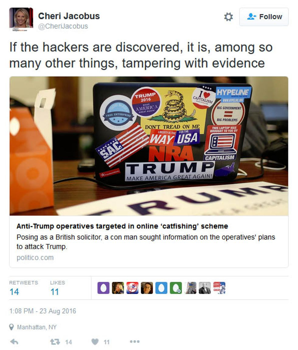 In one last bout of complete what-the-fuckery, after reporters began calling to let them know a story was being published about this weird bastard's shenanigans, thousands of emails from Jacobus's AOL account disappeared. Jacobus says she reported the apparent hack to the FBI, but it's anyone's guess as to what the FBI might find. The tweets to @JustBeingMeagan are still online, and everyone involved received a $250 gift card to a fancy hotel/restaurant, so there's that. But the really spooky part is the fact that Jacobus's hack is just another in a campaign that has seen so many hacking attempts aimed at wounding political operatives and organizations that are all anti-Trump.