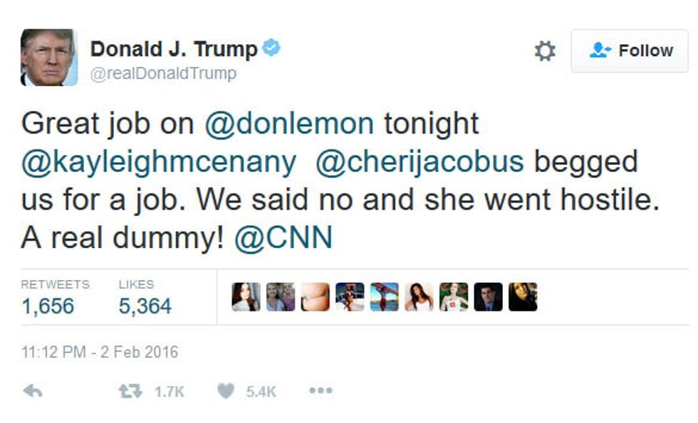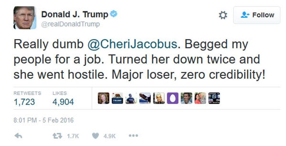 In February, Jacobus went on teevee and said some really mean things about Donald Trump which prompted Trump's then campaign manager (and permanent scowling trash monster) Corey Lewandowski to go on teevee and say really mean things about Cheri Jacobus. Trump followed in kind on Twitter, and that's when things start to get creepy.