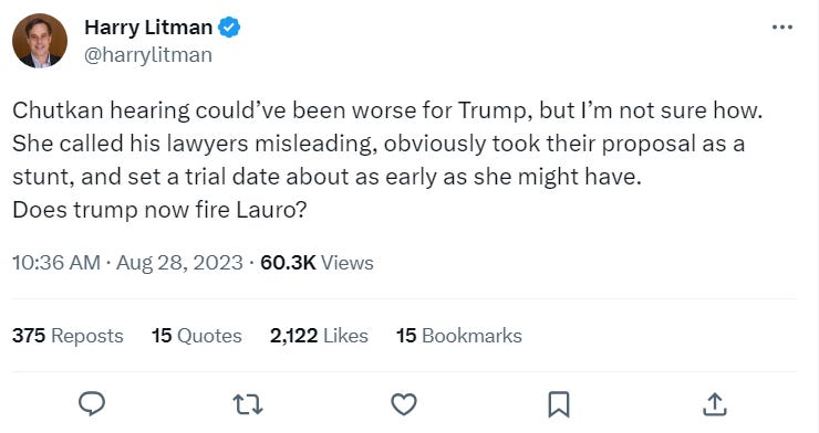 “Chutkan hearing could’ve been worse for Trump, but I’m not sure how. She called his lawyers misleading, obviously took their proposal as a stunt, and set a trial date about as early as she might have. Does Trump now fire Lauro?”