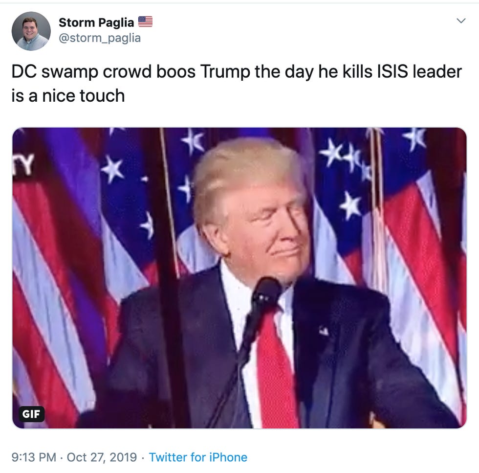 Last night, Donald Trump likely imagined he'd be taking a victory lap after the death of ISIS leader Abu Bakr al-Baghdadi . He probably imagined that even his worst detractors would be hailing him as a hero, despite the fact that he really had nothing to do with it at all. He probably thought it was safe to go to a public place that was not pre-packed with only his most devoted fans. That he could even attend the World Series, in a stadium with more seats than there are Trump voters in DC, and, at the very least, not be treated like the last living Cherry Sister.