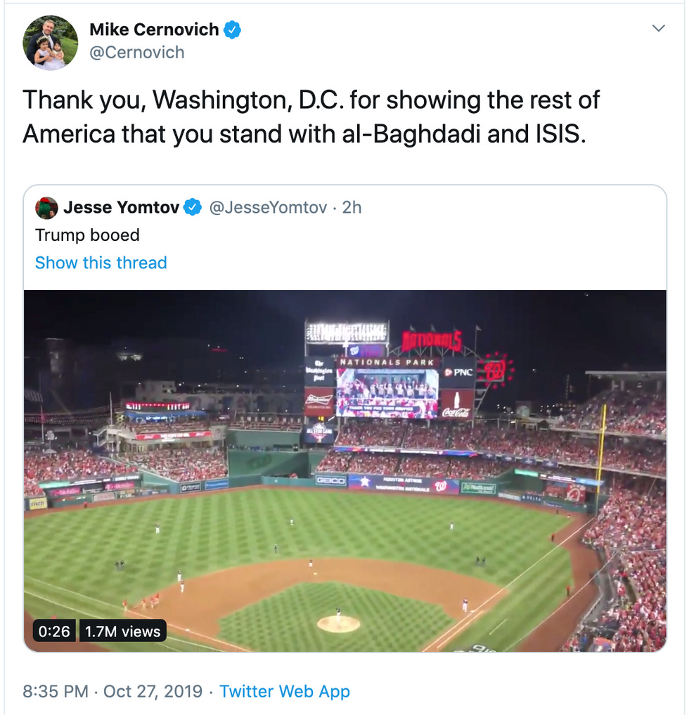 Naturally, right-wing Twitter went to an extremely normal well on this, claiming that Trump was booed because the stadium full of Nationals fans just really loves ISIS.