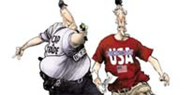 What was I talking about? Oh, right, Uncle Sam. Yeah, so Uncle Sam, like everyone else in America, can't be bothered to dress in his traditional eccentric but still formal outfit anymore. Instead, he just tucks his t-shirt into his belted, pleated khaki pants, like the rest of you slobs with no class. He's even wearing a baseball cap. A baseball cap! There are few things more depressing than seeing an elderly man wearing a baseball cap, but seeing your beloved national symbol doing so may be one of those things. Anyway, he's lost all claim to our respect, so frankly nobody is going to speak up when he's viciously tasered because he failed to show proper respect to some bored, surly rent-a-cop.